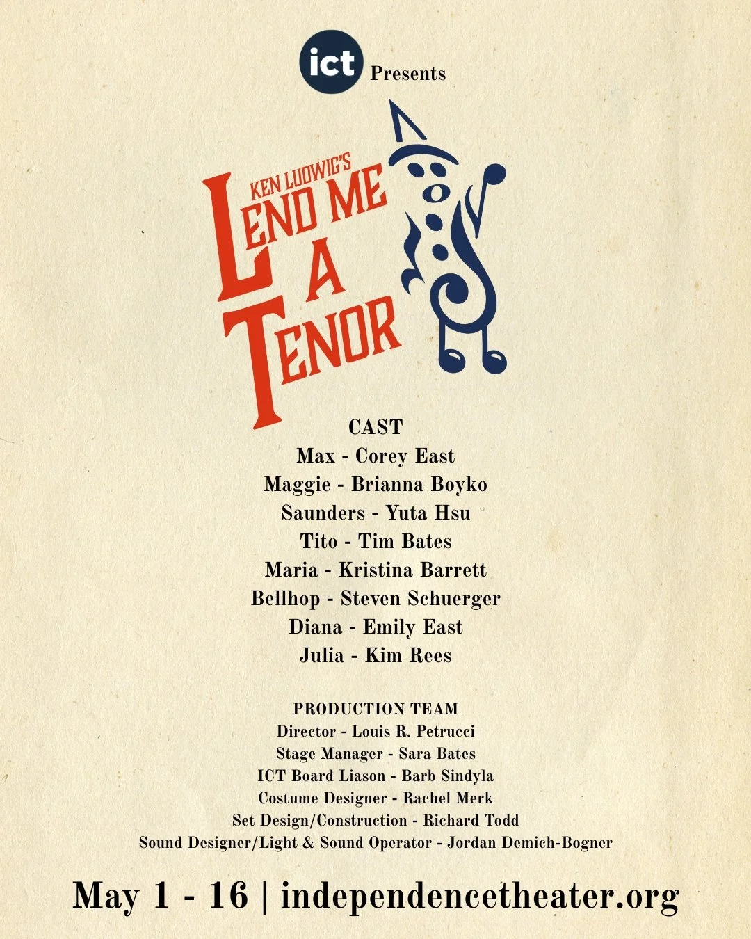 Stage Managed by Sara Bates Set against the backdrop of a bustling Cleveland Grand Opera Company in September 1934, riotous comedy follows the chaos surrounding the arrival of world-renowned tenor Tito Morelli. Morelli is poised to deliver a stunning performance of Pagliacci at the season opener, but his tardiness leads to a series of uproarious misunderstandings and mistaken identities.